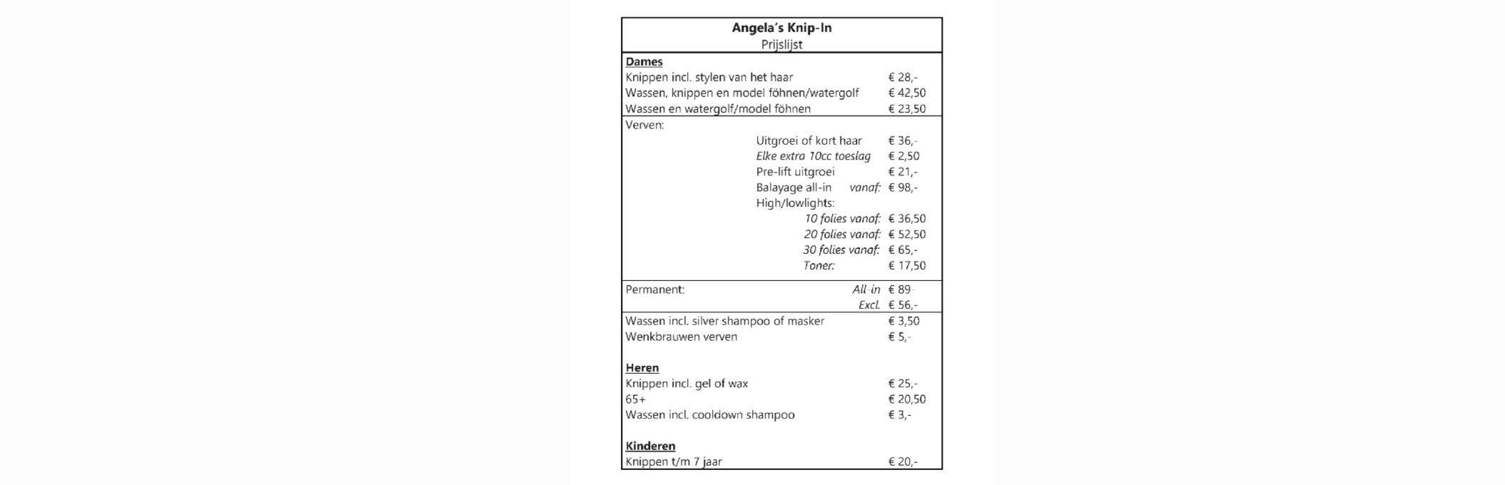 Wanneer u zich inschrijft op onze nieuwsbrief (pop-up form) geeft u uw naam, functie, huidige werksituatie en e-mailadres op. De verstrekte gegevens worden uitsluitend gebruikt voor het bezorgen van mailings en voor marketingdoeleinden vanuit Angela's knip in. De adressen worden niet gebruikt voor andere doeleinden en worden niet gedeeld met derden.